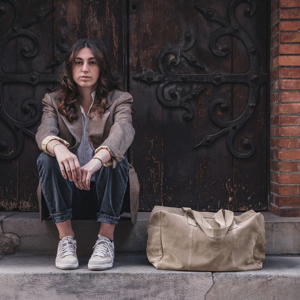 Pensé pour les escapades et les voyages spontanés, ce sac week-end en cuir velours conjugue élégance et praticité. Sa texture douce et sa belle tenue en font un allié de choix pour vos week-end et courts séjours. Fermeture zippée, doublure intérieure 100 % coton : un design soigné jusque dans les moindres détails.