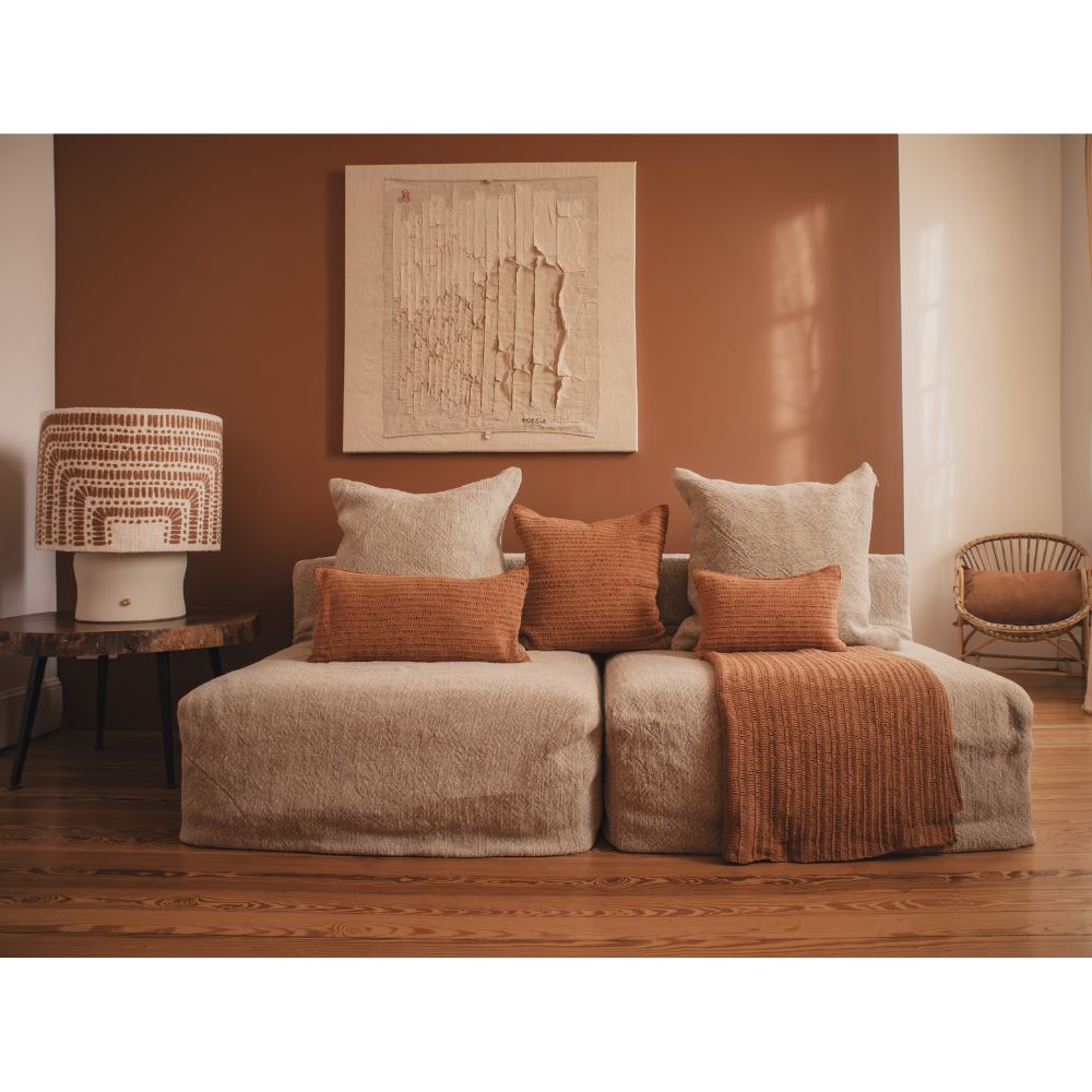 TIERRA DEL SOL est une collection en coton crocheté à la main. Chaque coussin est unique, marqué par son geste artisanal. Ses teintes terreuses (Sienna, Sand, Cusco) rappellent l’éclat d’un désert espagnol et apportent chaleur et authenticité à l’intérieur.