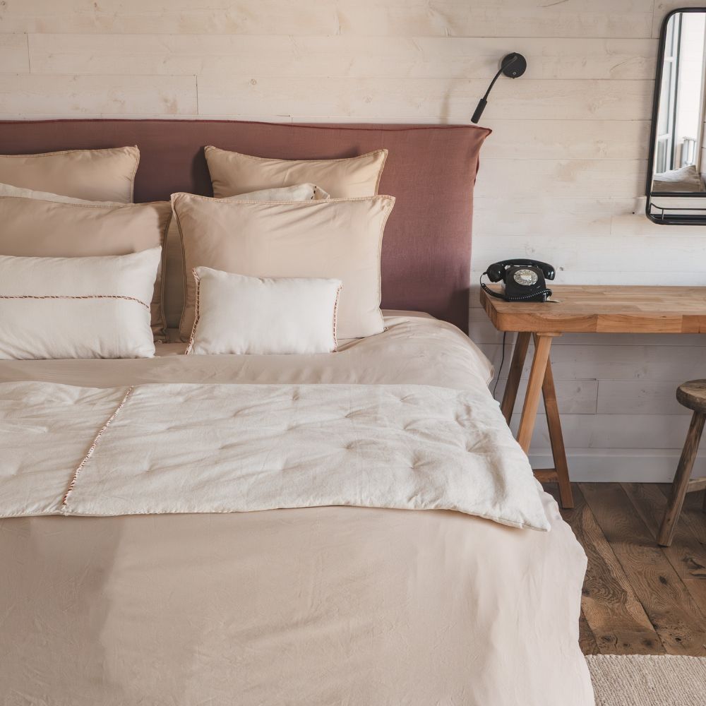 La finition passepoil dans l'univers du linge de maison désigne l'ajout d’un fin cordon ou d’une bande de tissu insérée dans les coutures, soulignant avec élégance les contours des coussins, oreillers, housses de couette et autres articles textiles.