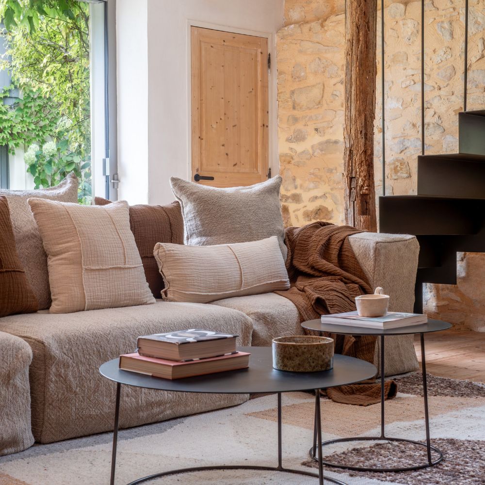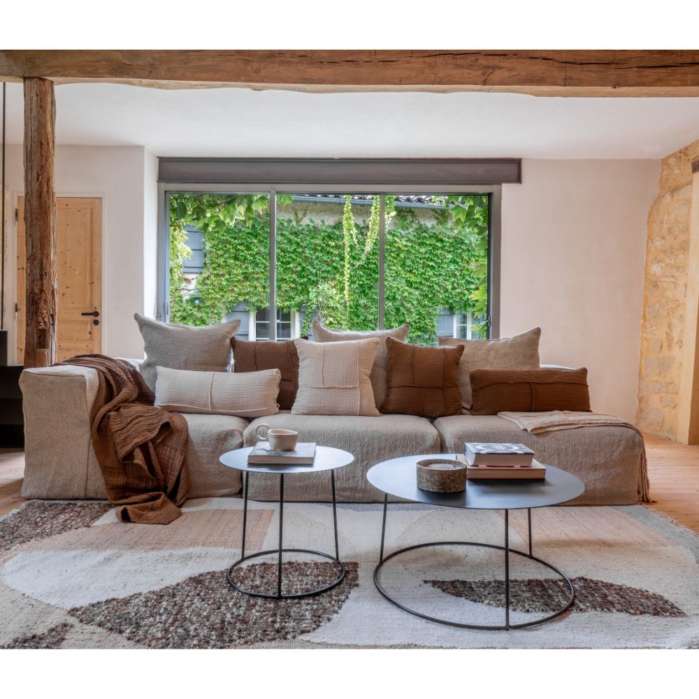 Conçu dans un mélange de coton et de lin, le coussin NIRVANA se distingue par un empiècement de patch, assemblé par des bords francs structurant le tissu. Ce détail artisanal sublime le coussin d’un effet vintage à la fois intemporel et authentique.