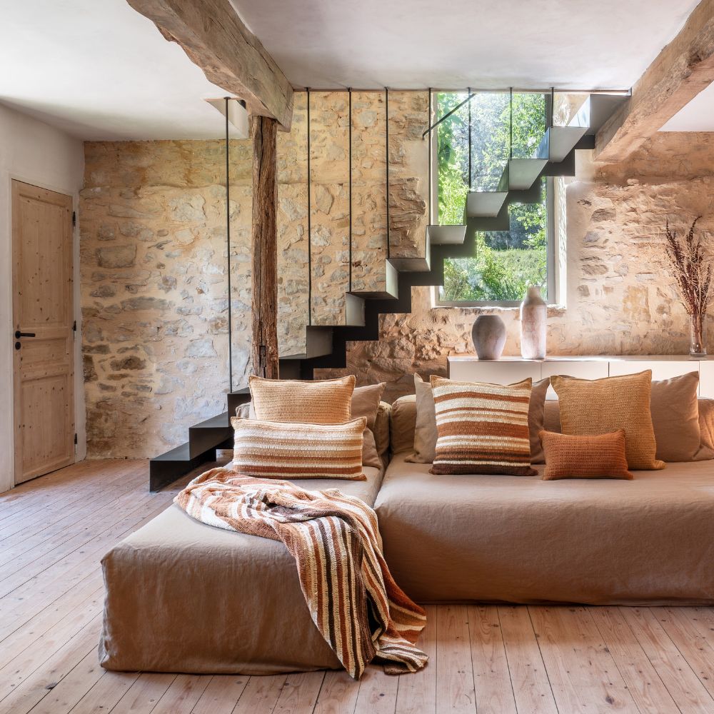 TIERRA DEL SOL est une collection en coton crocheté à la main. Chaque coussin et chaque plaid est unique, marqué par son geste artisanal. Ses teintes terreuses (Sienna, Sand, Cusco) rappellent l’éclat d’un désert espagnol et apportent chaleur et authenticité à l’intérieur.