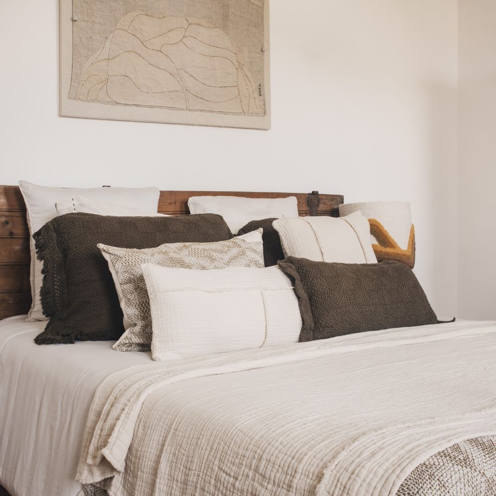 Découvrez le coussin rectangulaire VÉSUVE en coton, format 40 x 60 cm. Son motif subtil évoque un feuillage abstrait, révélé par un jeu de nuances entre le vert Havane et une tonalité plus claire qui apporte relief et douceur à l’ensemble.