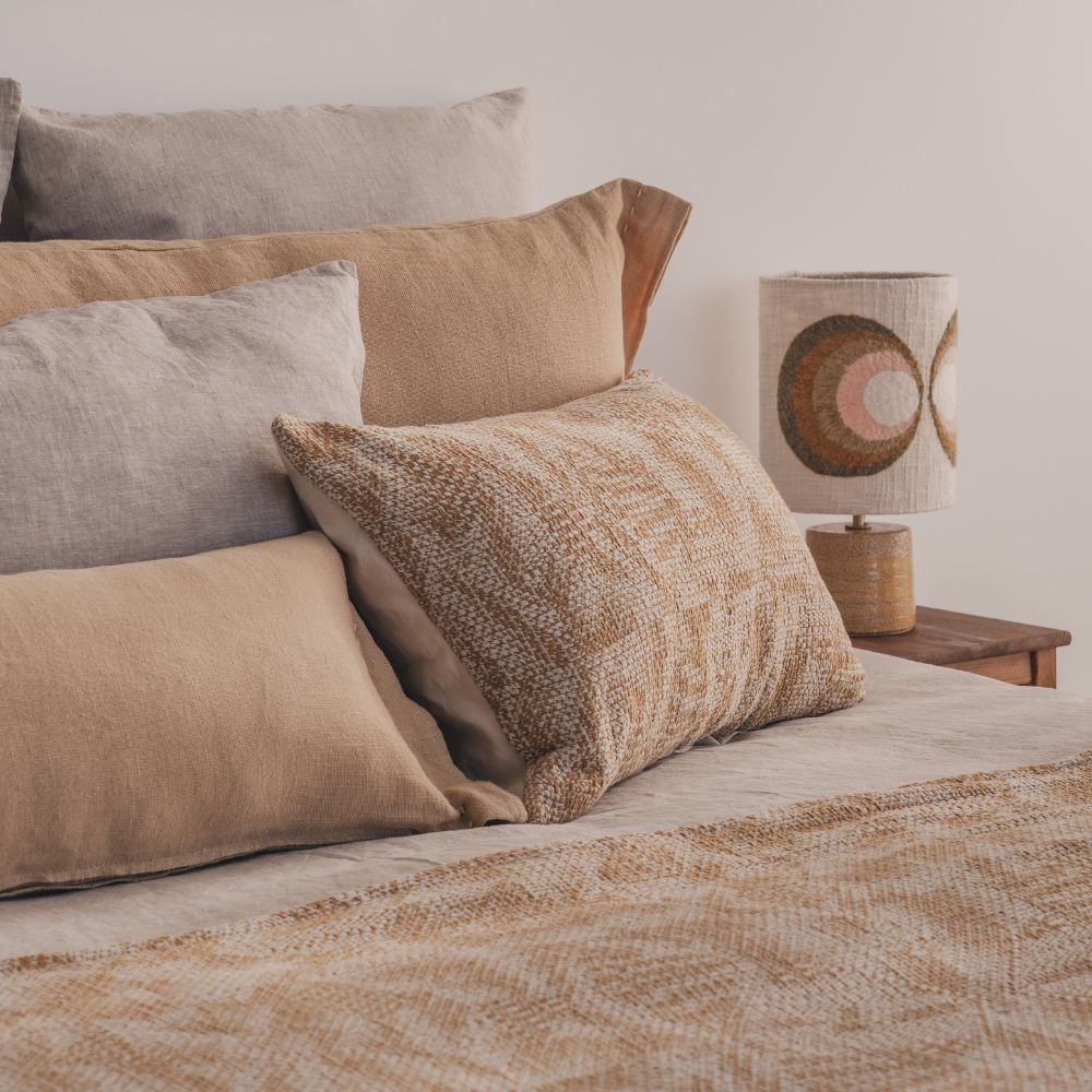 Découvrez le coussin rectangulaire VÉSUVE en coton, format 40 x 60 cm. Son motif subtil évoque un feuillage abstrait, révélé par un jeu de nuances entre le beige doré nommé Narcisse et une tonalité plus claire qui apporte relief et douceur à l’ensemble.