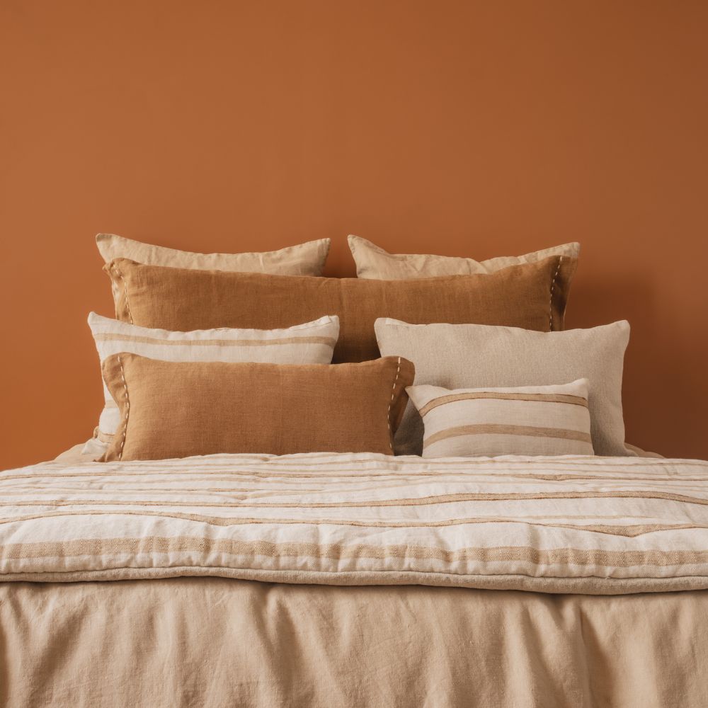 Ce couvre-lit rayé en lin et coton séduit par la subtilité de son tissage en chevron miroir, qui crée un rythme graphique délicat tout en conservant une grande douceur visuelle. Sa teinte Pêche, lumineuse et chaleureuse, apporte fraîcheur et naturel à la chambre.